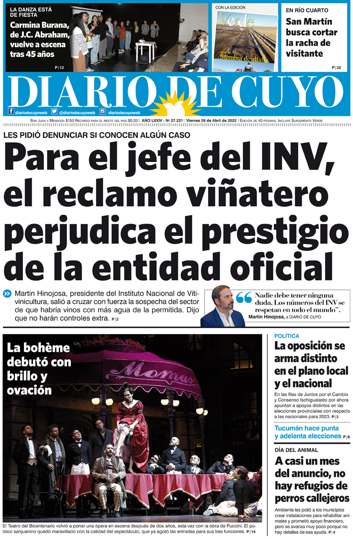 Diario de Cuyo | HOME | Noticias Tapa Edición 29 de Abril del 2022 Por Redacción Diario de Cuyo 29/04/2022 · 0:00 Escuchar la noticia Escuchar la noticia Your browser doesn’t support HTML5 audio Ver los comentarios ›