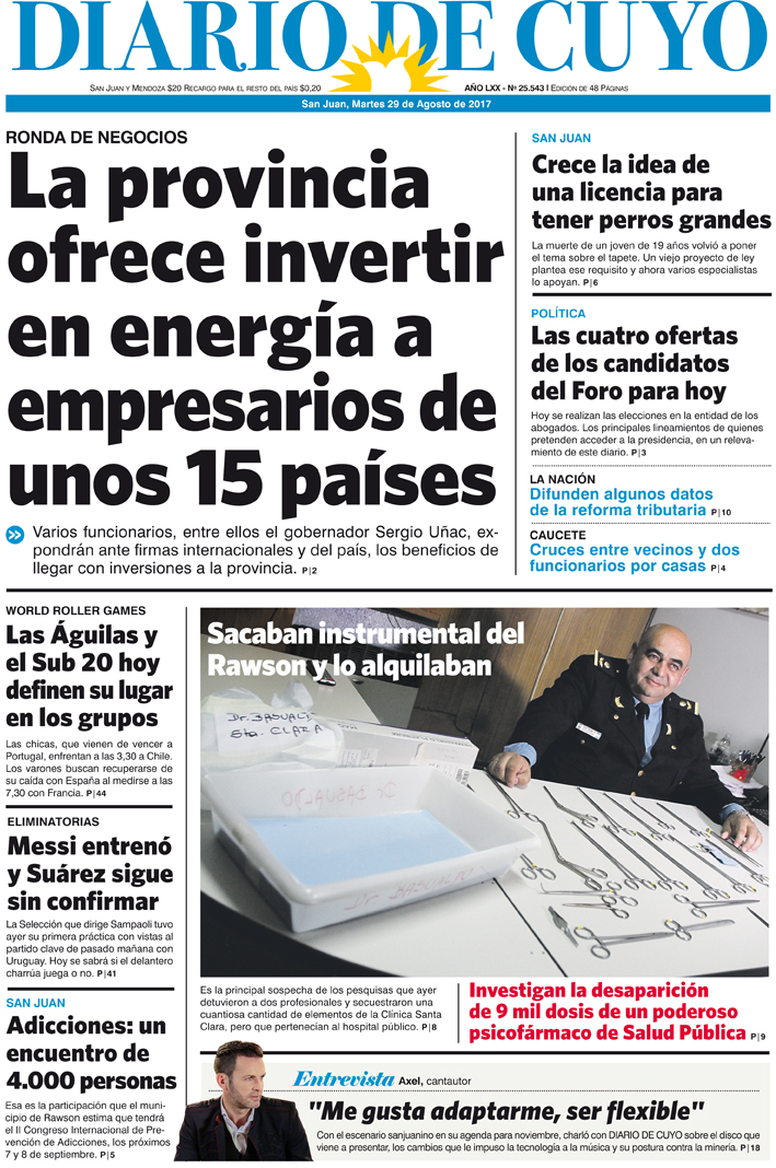 Diario de Cuyo | HOME | Noticias Tapa Edición 29 de Agosto de 2017 Por Redacción Diario de Cuyo 28/08/2017 · 0:00 Escuchar la noticia Escuchar la noticia Your browser doesn’t support HTML5 audio Ver los comentarios ›
