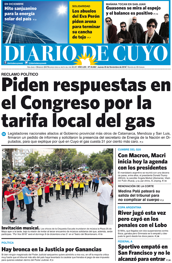 Diario de Cuyo | HOME | Noticias | Tapa Edición Tapa Edición 29 de Noviembre 2018 Por Redacción Diario de Cuyo 29/11/2018 · 0:00 Escuchar la noticia Escuchar la noticia Your browser doesn’t support HTML5 audio Tapa Edición Ver los comentarios ›