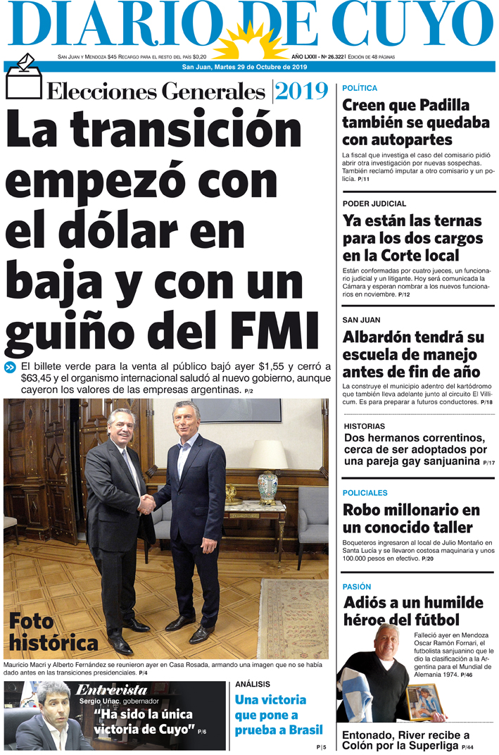 Diario de Cuyo | HOME | Noticias | Tapa Edición Tapa Edición 29 de Octubre 2019 Por Redacción Diario de Cuyo 29/10/2019 · 0:00 Escuchar la noticia Escuchar la noticia Your browser doesn’t support HTML5 audio Tapa Edición Ver los comentarios ›