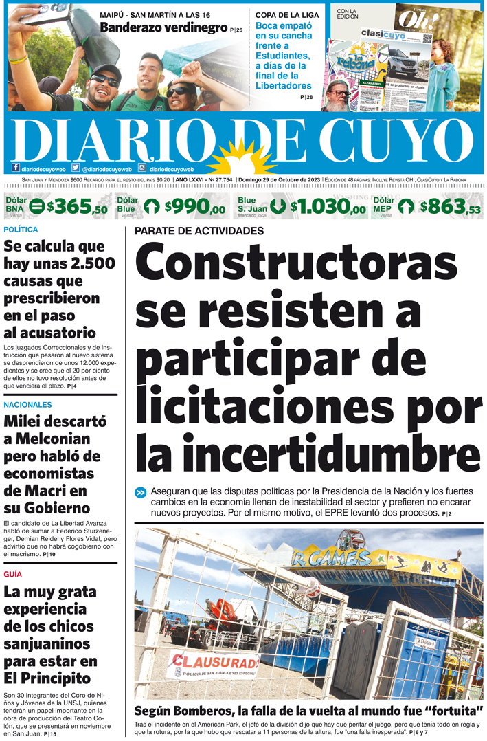 Diario de Cuyo | HOME | Noticias Tapa Edición 29 de Octubre del 2023 Por Redacción Diario de Cuyo 28/10/2023 · 0:00 Escuchar la noticia Escuchar la noticia Your browser doesn’t support HTML5 audio Ver los comentarios ›