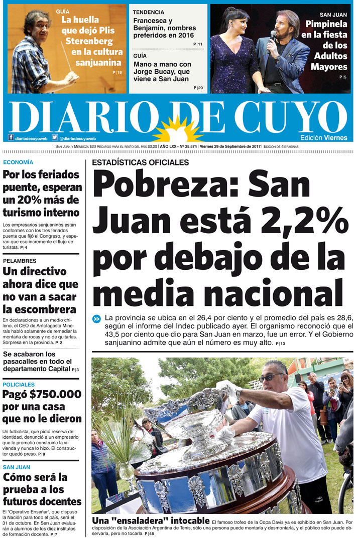 Diario de Cuyo | HOME | Noticias Tapa Edición 29 de Septiembre de 2017 Por Redacción Diario de Cuyo 29/09/2017 · 0:00 Escuchar la noticia Escuchar la noticia Your browser doesn’t support HTML5 audio Ver los comentarios ›