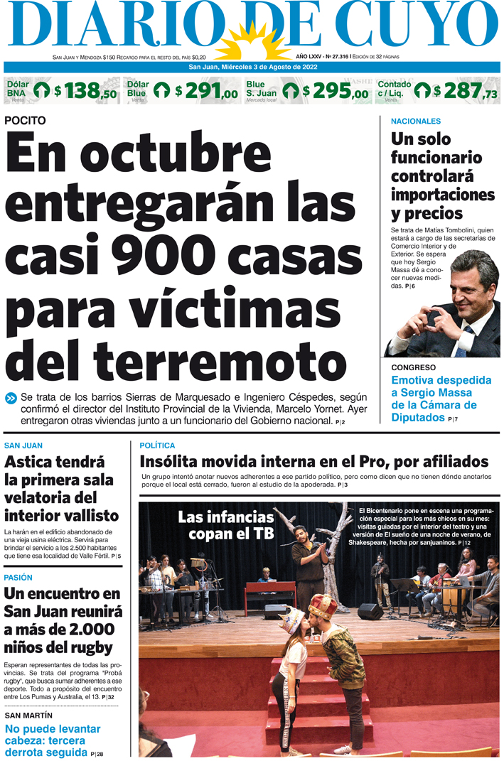 Diario de Cuyo | HOME | Noticias Tapa Edición 3 de Agosto de 2022 Por Redacción Diario de Cuyo 02/08/2022 · 0:00 Escuchar la noticia Escuchar la noticia Your browser doesn’t support HTML5 audio Ver los comentarios ›