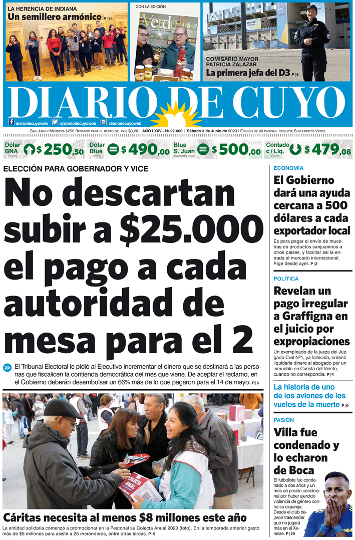 Diario de Cuyo | HOME | Noticias Tapa Edición 3 de Junio de 2023 Por Redacción Diario de Cuyo 02/06/2023 · 0:00 Escuchar la noticia Escuchar la noticia Your browser doesn’t support HTML5 audio Ver los comentarios ›