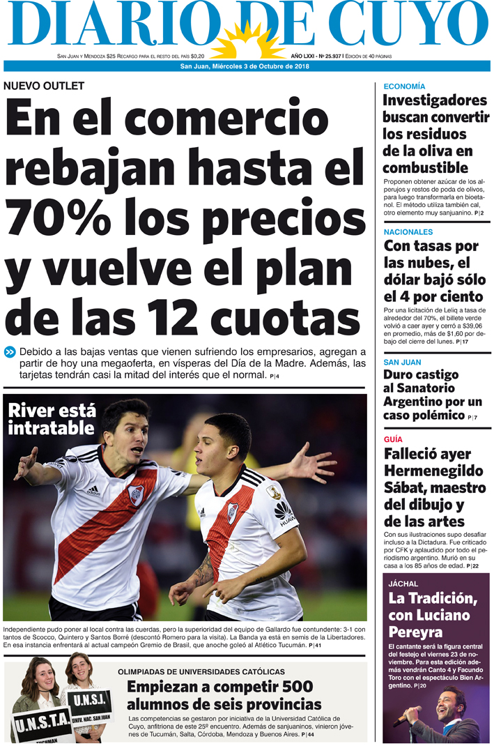 Diario de Cuyo | HOME | Noticias | Tapa Edición Tapa Edición 3 de Octubre 2018 Por Redacción Diario de Cuyo 03/10/2018 · 0:00 Escuchar la noticia Escuchar la noticia Your browser doesn’t support HTML5 audio Tapa Edición Ver los comentarios ›
