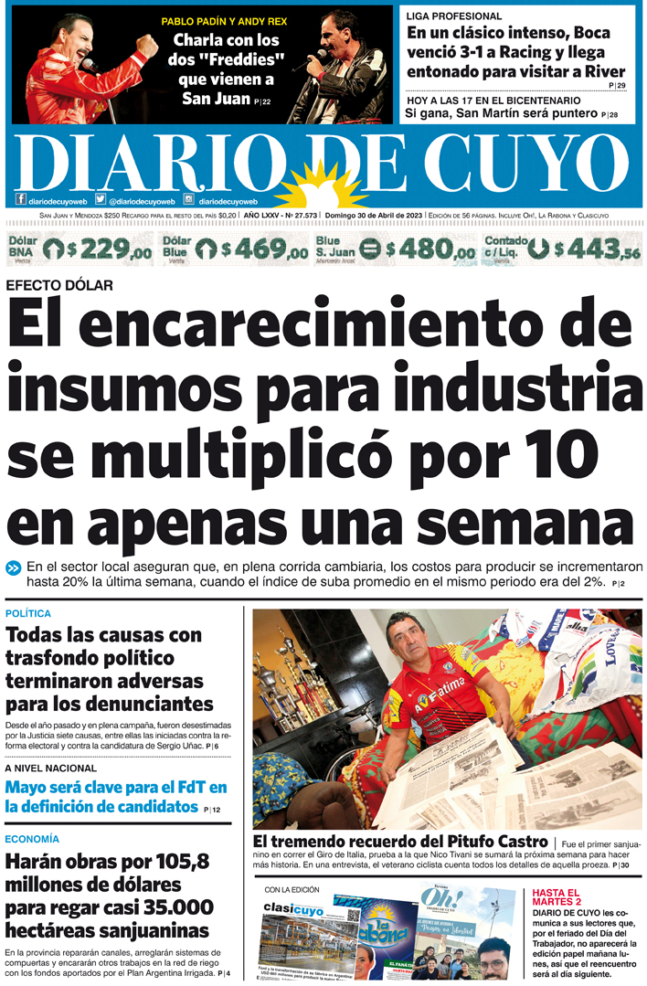 Diario de Cuyo | HOME | Noticias Tapa Edición 30 de Abril de 2023 Por Redacción Diario de Cuyo 30/04/2023 · 0:00 Escuchar la noticia Escuchar la noticia Your browser doesn’t support HTML5 audio Ver los comentarios ›