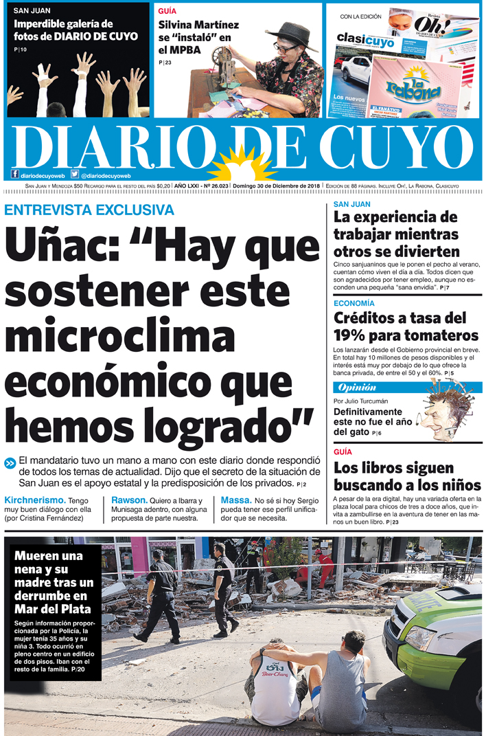 Diario de Cuyo | HOME | Noticias | Tapa Edición Tapa Edición 30 de Diciembre 2018 Por Redacción Diario de Cuyo 29/12/2018 · 0:00 Escuchar la noticia Escuchar la noticia Your browser doesn’t support HTML5 audio Tapa Edición Ver los comentarios ›