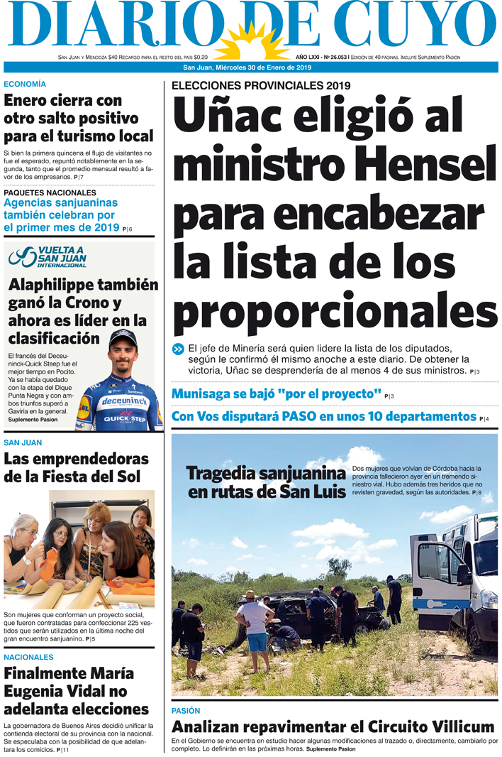 Diario de Cuyo | HOME | Noticias | Tapa Edición Tapa Edición 30 de Enero de 2019 Por Redacción Diario de Cuyo 30/01/2019 · 0:00 Escuchar la noticia Escuchar la noticia Your browser doesn’t support HTML5 audio Tapa Edición Ver los comentarios ›