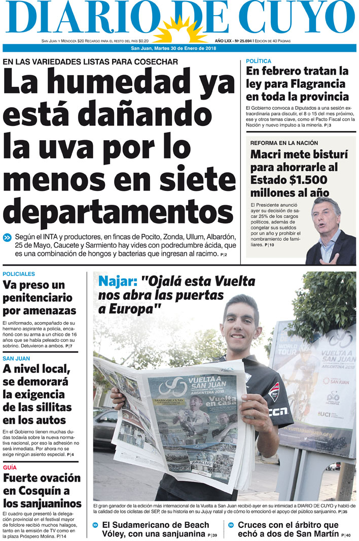 Diario de Cuyo | HOME | Noticias | Tapa Edición Tapa Edición 30 de Enero del 2018 Por Redacción Diario de Cuyo 29/01/2018 · 0:00 Escuchar la noticia Escuchar la noticia Your browser doesn’t support HTML5 audio Tapa Edición Ver los comentarios ›