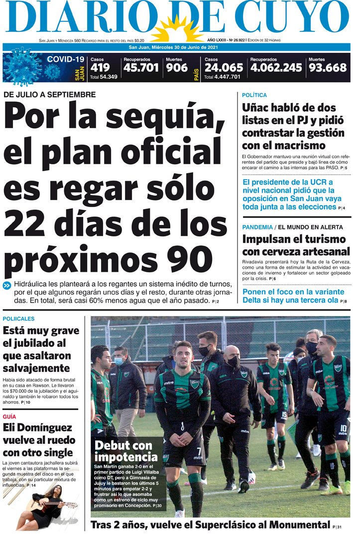 Diario de Cuyo | HOME | Noticias Tapa Edición 30 de Junio del 2021 Por Redacción Diario de Cuyo 29/06/2021 · 0:00 Escuchar la noticia Escuchar la noticia Your browser doesn’t support HTML5 audio Ver los comentarios ›