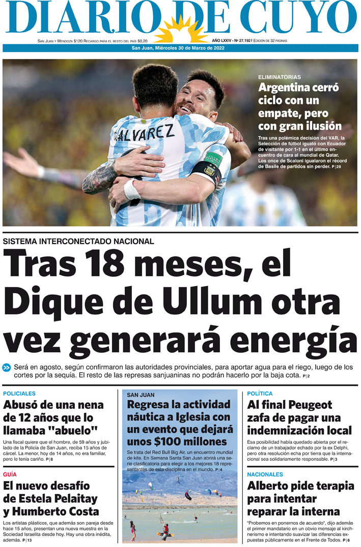 Diario de Cuyo | HOME | Noticias Tapa Edición 30 de Marzo del 2022 Por Redacción Diario de Cuyo 29/03/2022 · 0:00 Escuchar la noticia Escuchar la noticia Your browser doesn’t support HTML5 audio Ver los comentarios ›