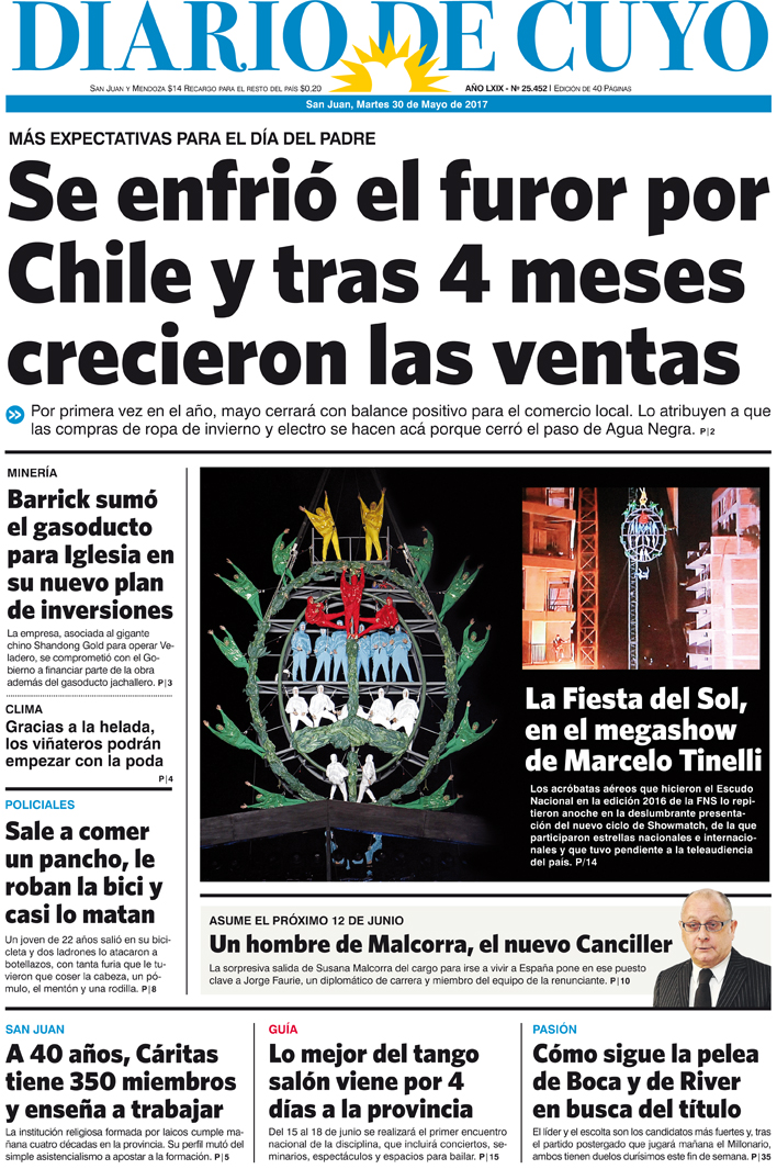 Diario de Cuyo | HOME | Noticias Tapa Edición 30 de Mayo de 2017 Por Redacción Diario de Cuyo 30/05/2017 · 0:00 Escuchar la noticia Escuchar la noticia Your browser doesn’t support HTML5 audio Ver los comentarios ›