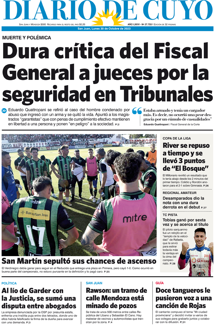 Diario de Cuyo | HOME | Noticias Tapa Edición 30 de Octubre del 2023 Por Redacción Diario de Cuyo 29/10/2023 · 0:00 Escuchar la noticia Escuchar la noticia Your browser doesn’t support HTML5 audio Ver los comentarios ›
