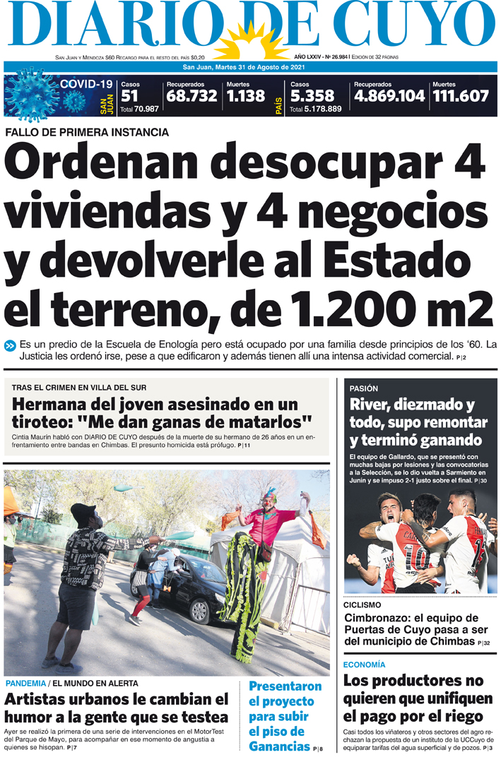 Diario de Cuyo | HOME | Noticias Tapa Edición 31 de Agosto del 2021 Por Redacción Diario de Cuyo 30/08/2021 · 0:00 Escuchar la noticia Escuchar la noticia Your browser doesn’t support HTML5 audio Ver los comentarios ›