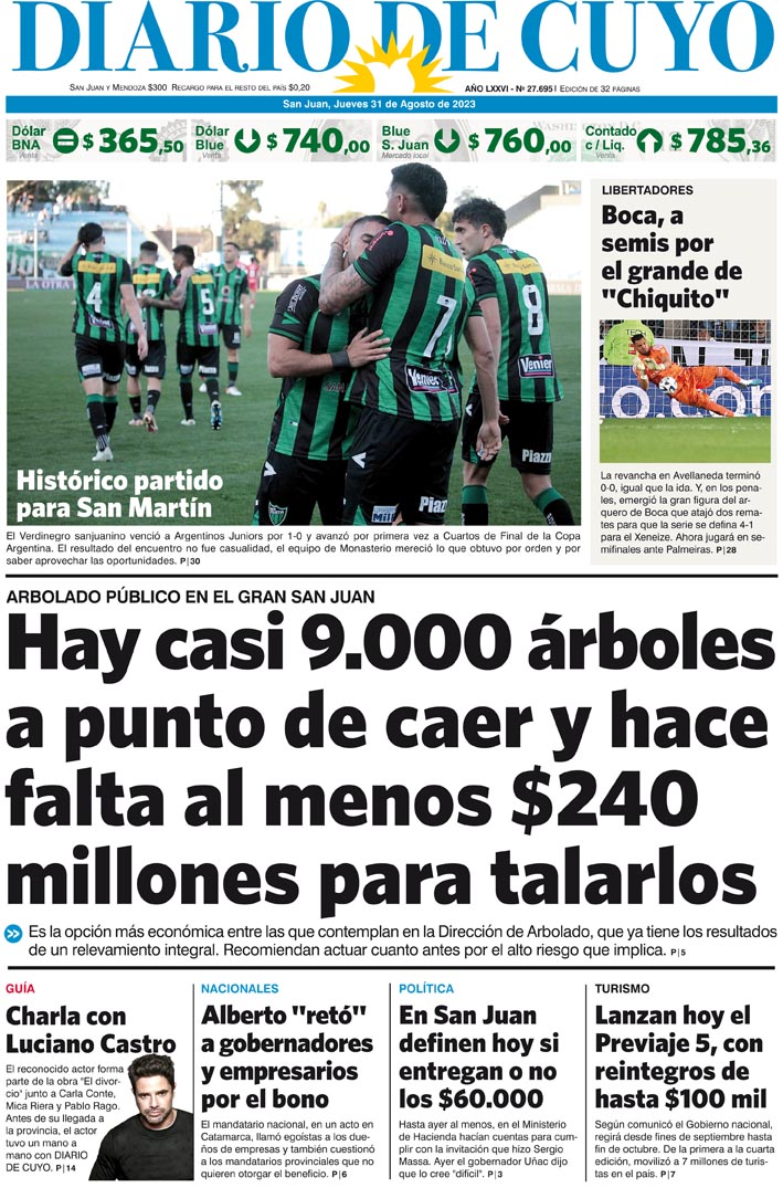 Diario de Cuyo | HOME | Noticias Tapa Edición 31 de Agosto del 2023 Por Redacción Diario de Cuyo 31/08/2023 · 0:00 Escuchar la noticia Escuchar la noticia Your browser doesn’t support HTML5 audio Ver los comentarios ›