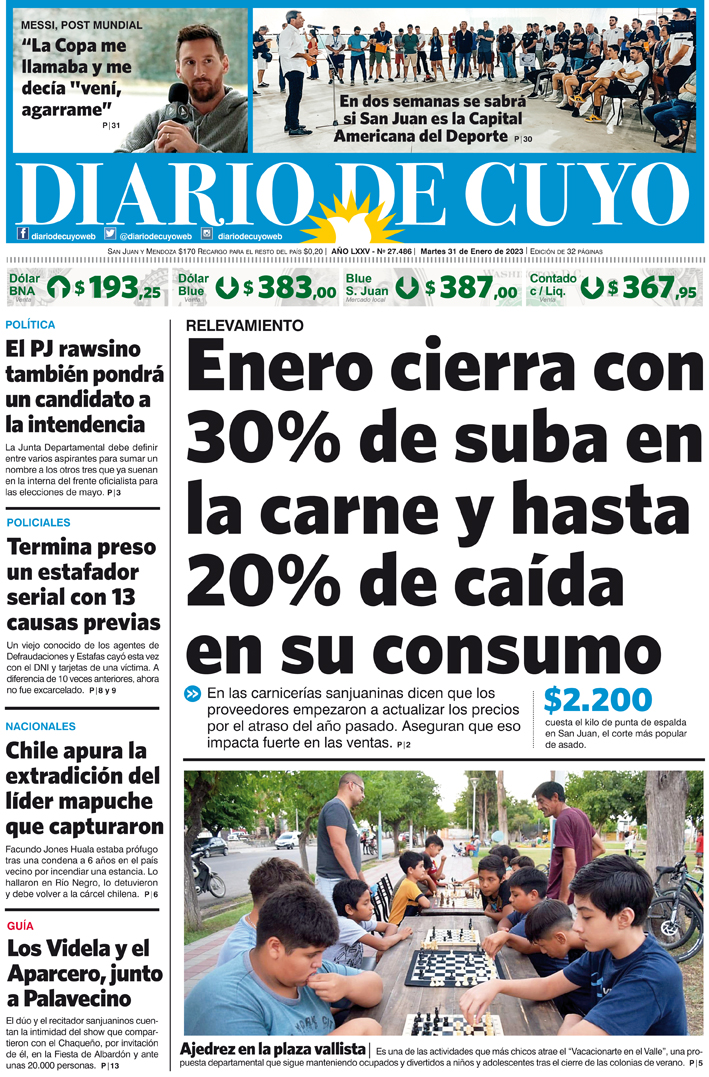 Diario de Cuyo | HOME | Noticias Tapa Edición 31 de Enero del 2023 Por Redacción Diario de Cuyo 30/01/2023 · 0:00 Escuchar la noticia Escuchar la noticia Your browser doesn’t support HTML5 audio Ver los comentarios ›
