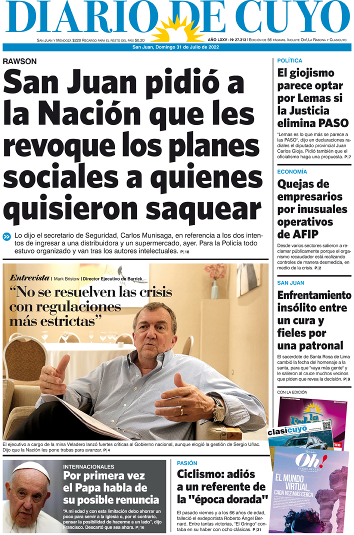 Diario de Cuyo | HOME | Noticias Tapa Edición 31 de Julio del 2022 Por Redacción Diario de Cuyo 30/07/2022 · 0:00 Escuchar la noticia Escuchar la noticia Your browser doesn’t support HTML5 audio Ver los comentarios ›