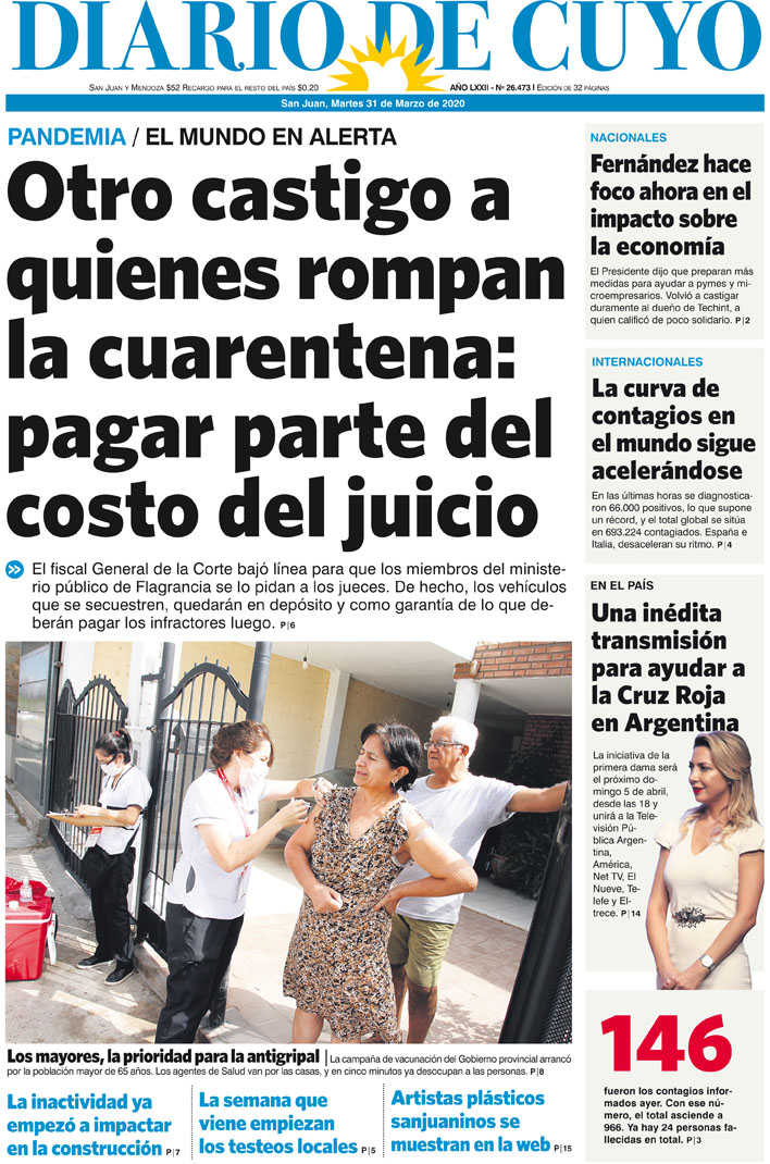 Diario de Cuyo | HOME | Noticias Tapa Edición 31 de Marzo del 2020 Por Redacción Diario de Cuyo 30/03/2020 · 0:00 Escuchar la noticia Escuchar la noticia Your browser doesn’t support HTML5 audio Ver los comentarios ›
