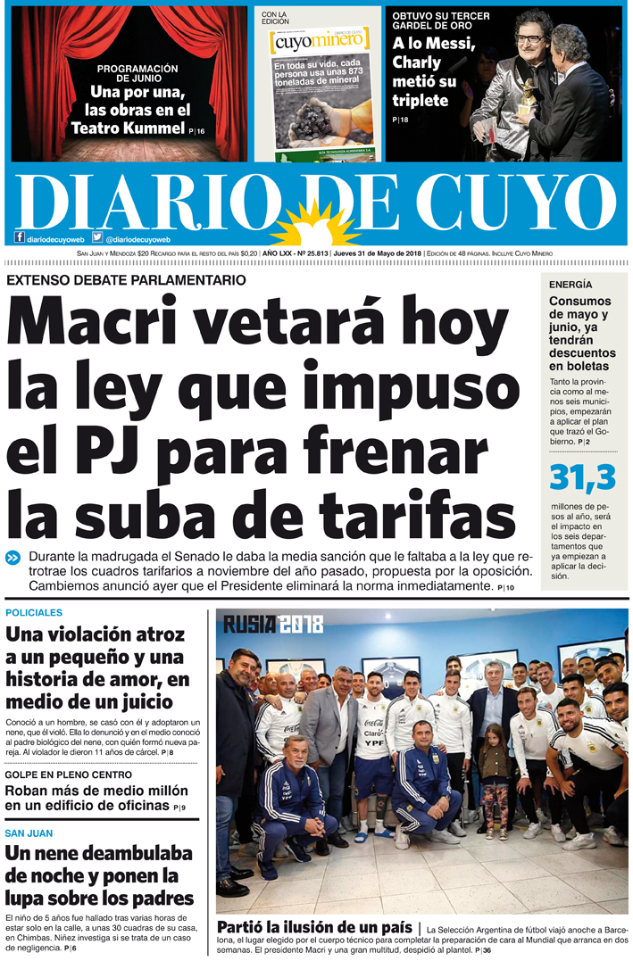 Diario de Cuyo | HOME | Noticias | Tapa Edición Tapa Edición 31 de Mayo 2018 Por Redacción Diario de Cuyo 31/05/2018 · 0:00 Escuchar la noticia Escuchar la noticia Your browser doesn’t support HTML5 audio Tapa Edición Ver los comentarios ›