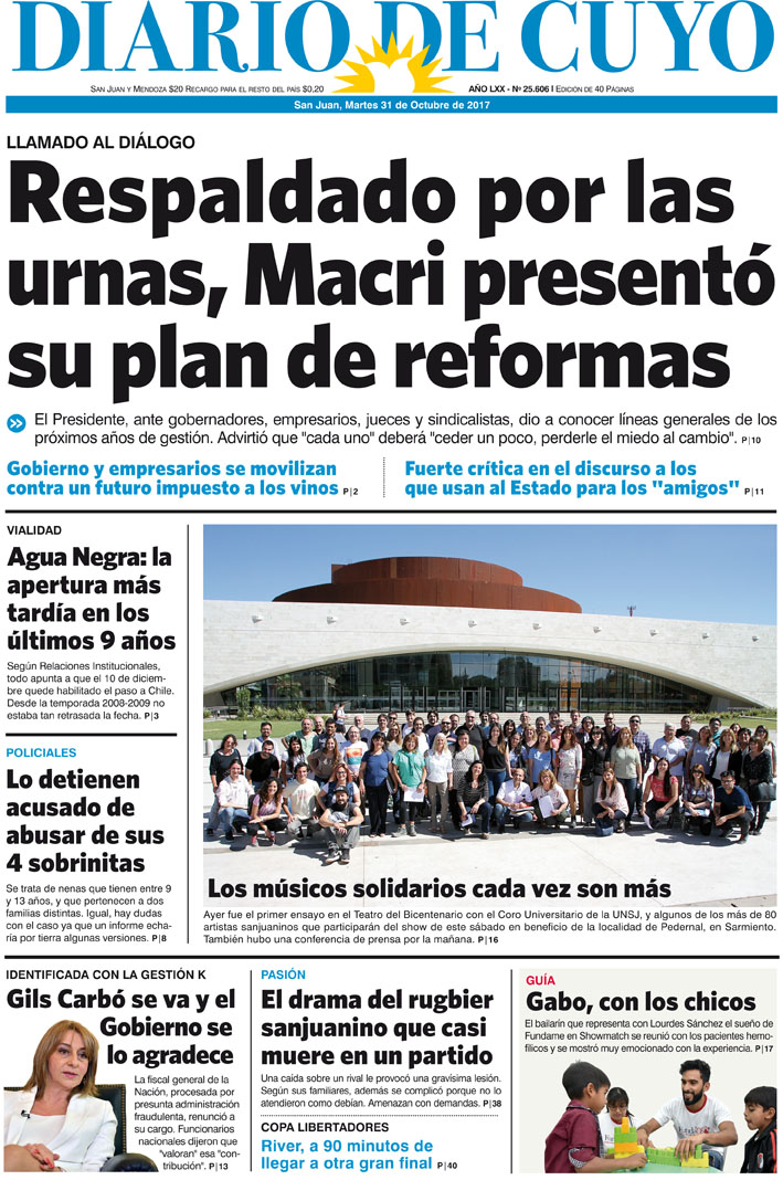 Diario de Cuyo | HOME | Noticias | Tapa Edición Tapa Edición 31 de Octubre del 2017 Por Redacción Diario de Cuyo 31/10/2017 · 0:00 Escuchar la noticia Escuchar la noticia Your browser doesn’t support HTML5 audio Tapa Edición Ver los comentarios ›
