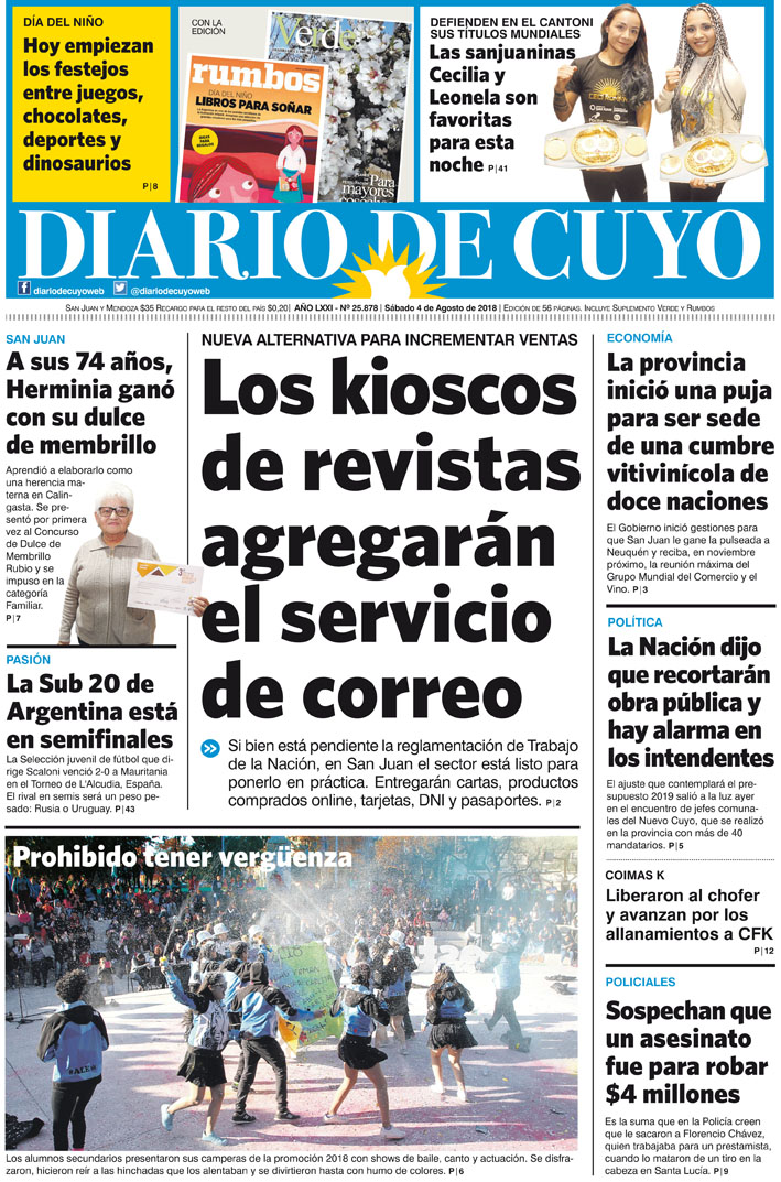 Diario de Cuyo | HOME | Noticias | Tapa Edición Tapa Edición 4 de Agosto 2018 Por Redacción Diario de Cuyo 03/08/2018 · 0:00 Escuchar la noticia Escuchar la noticia Your browser doesn’t support HTML5 audio Tapa Edición Ver los comentarios ›