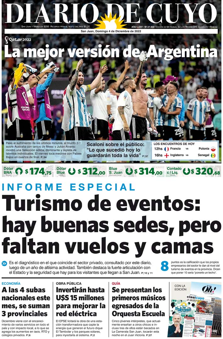 Diario de Cuyo | HOME | Noticias Tapa Edición 4 de Diciembre de 2022 Por Redacción Diario de Cuyo 03/12/2022 · 0:00 Escuchar la noticia Escuchar la noticia Your browser doesn’t support HTML5 audio Ver los comentarios ›