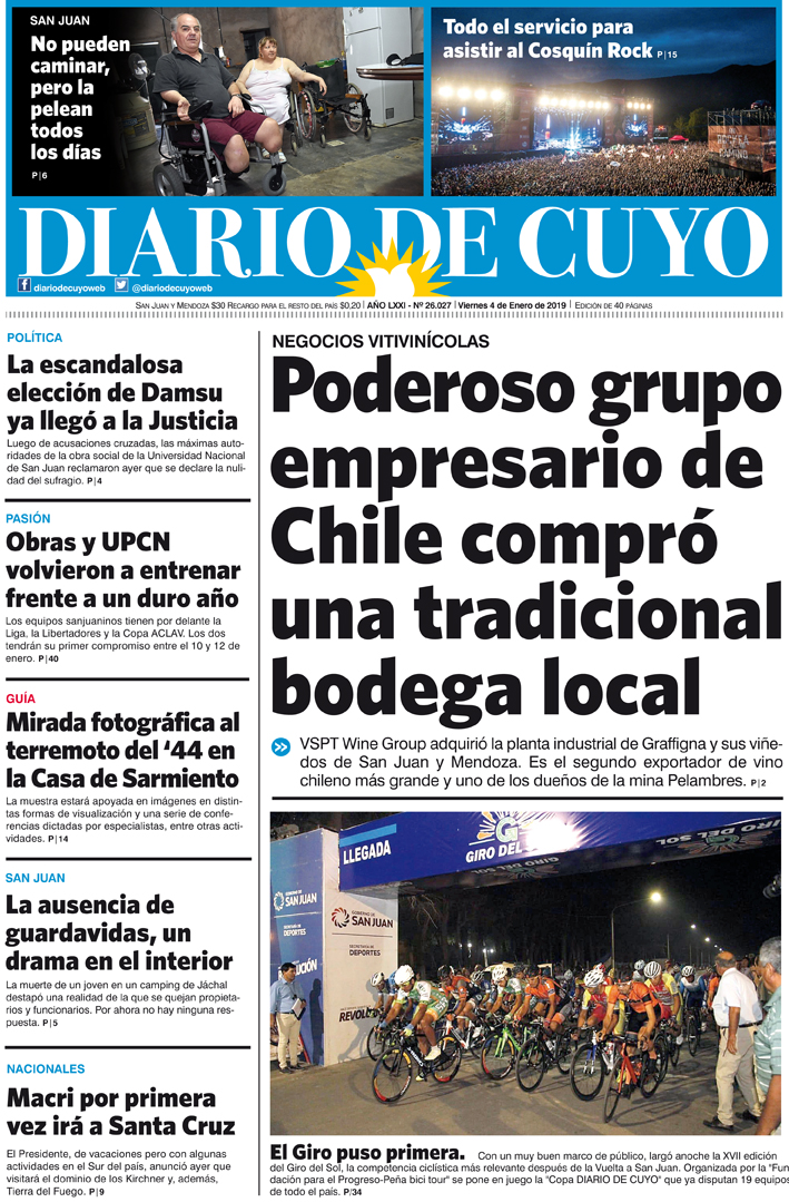 Diario de Cuyo | HOME | Noticias | Tapa Edición Tapa Edición 4 de Enero 2019 Por Redacción Diario de Cuyo 03/01/2019 · 0:00 Escuchar la noticia Escuchar la noticia Your browser doesn’t support HTML5 audio Tapa Edición Ver los comentarios ›
