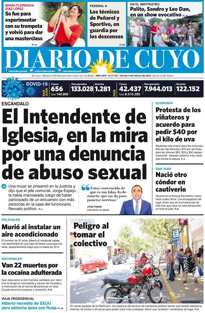 Diario de Cuyo | HOME | Noticias Tapa Edición 4 de Febrero de 2022 Por Redacción Diario de Cuyo 03/02/2022 · 0:00 Escuchar la noticia Escuchar la noticia Your browser doesn’t support HTML5 audio Ver los comentarios ›