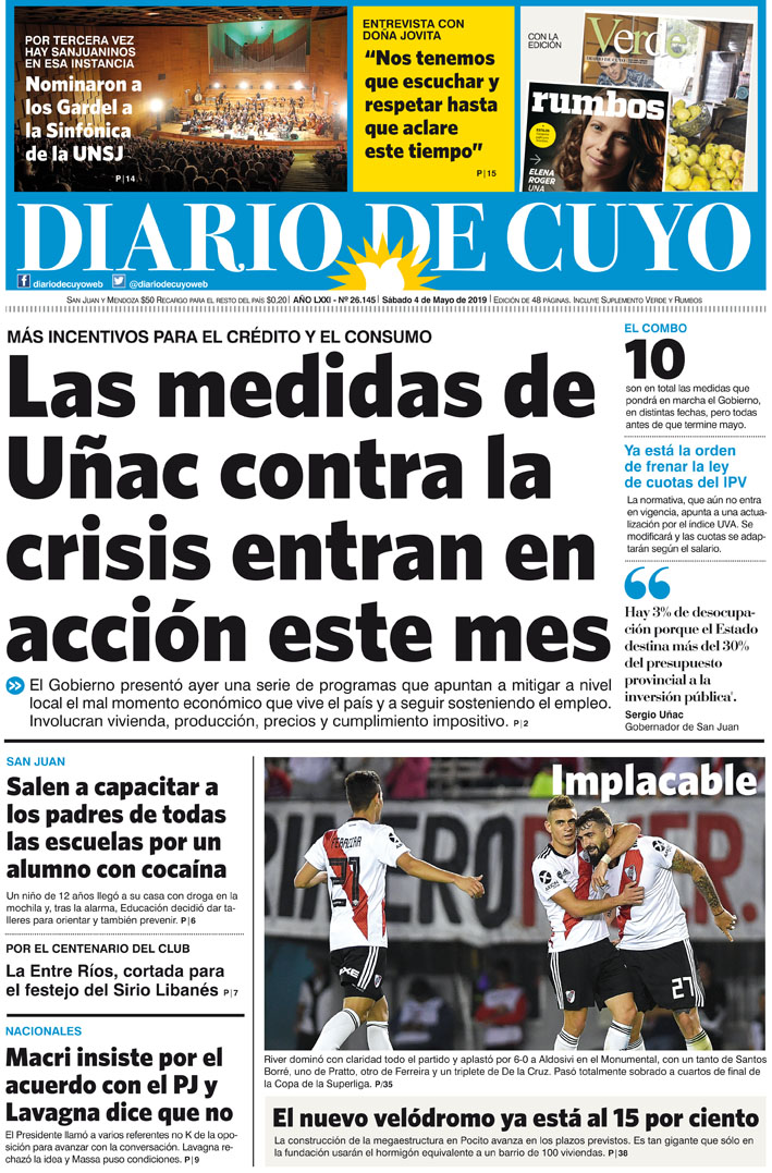 Diario de Cuyo | HOME | Noticias Tapa Edición 4 de Mayo 2019 Por Redacción Diario de Cuyo 03/05/2019 · 0:00 Escuchar la noticia Escuchar la noticia Your browser doesn’t support HTML5 audio Ver los comentarios ›