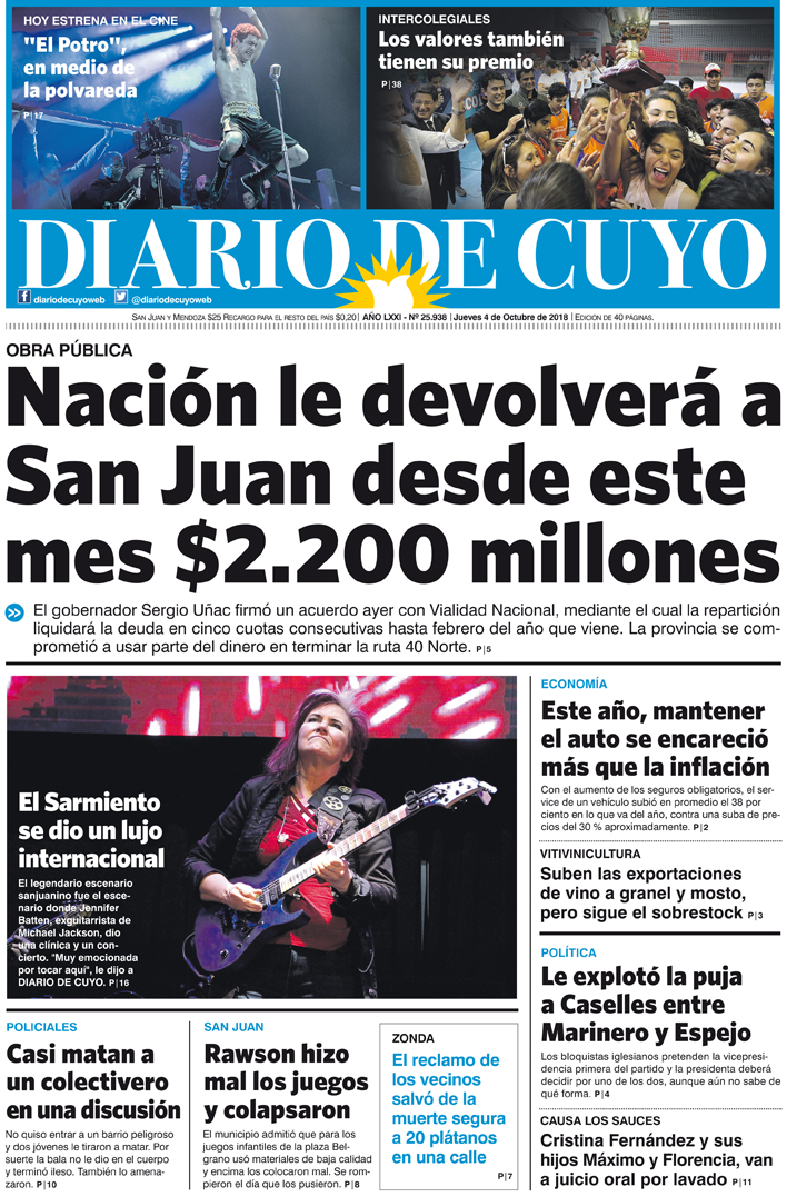 Diario de Cuyo | HOME | Noticias | Tapa Edición Tapa Edición 4 de Octubre 2018 Por Redacción Diario de Cuyo 03/10/2018 · 0:00 Escuchar la noticia Escuchar la noticia Your browser doesn’t support HTML5 audio Tapa Edición Ver los comentarios ›