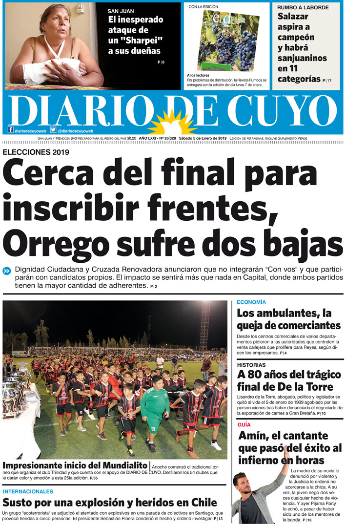 Diario de Cuyo | HOME | Noticias | Tapa Edición Tapa Edición 5 de Enero 2019 Por Redacción Diario de Cuyo 05/01/2019 · 0:00 Escuchar la noticia Escuchar la noticia Your browser doesn’t support HTML5 audio Tapa Edición Ver los comentarios ›