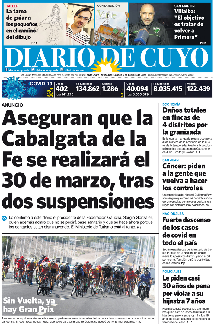 Diario de Cuyo | HOME | Noticias Tapa Edición 5 de Febrero de 2022 Por Redacción Diario de Cuyo 04/02/2022 · 0:00 Escuchar la noticia Escuchar la noticia Your browser doesn’t support HTML5 audio Ver los comentarios ›