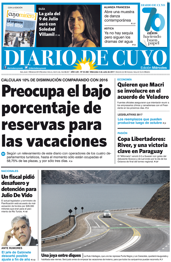 Diario de Cuyo | HOME | Noticias Tapa Edición 5 de Julio del 2017 Por Redacción Diario de Cuyo 05/07/2017 · 0:00 Escuchar la noticia Escuchar la noticia Your browser doesn’t support HTML5 audio Ver los comentarios ›