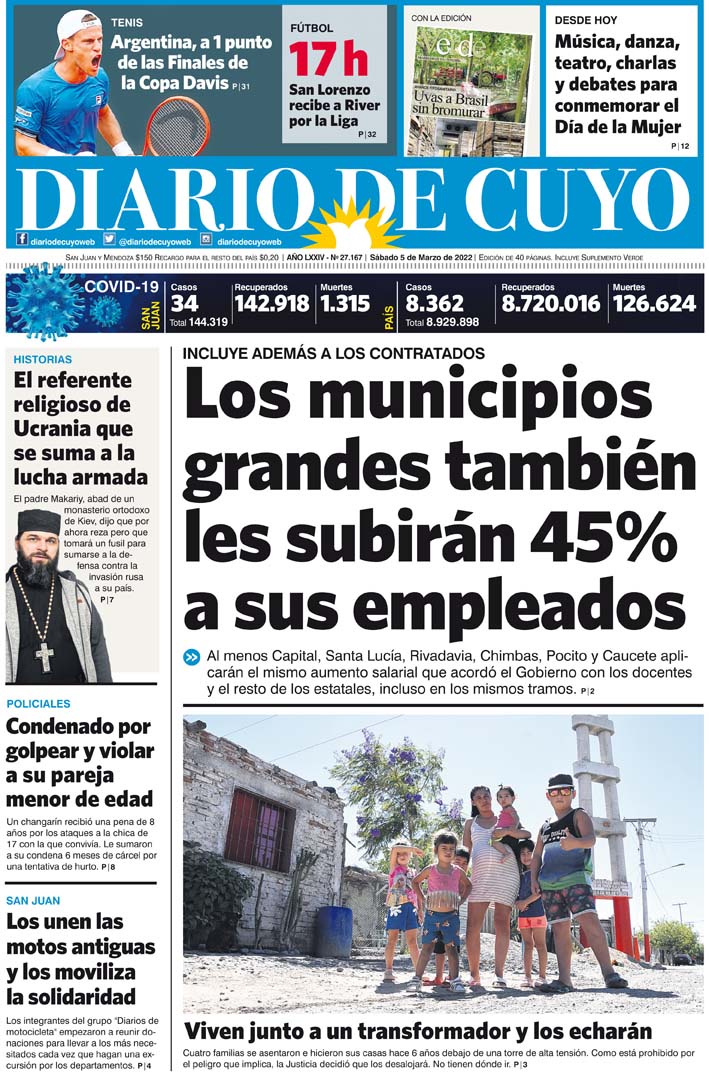 Diario de Cuyo | HOME | Noticias Tapa Edición 5 de Marzo de 2022 Por Redacción Diario de Cuyo 04/03/2022 · 0:00 Escuchar la noticia Escuchar la noticia Your browser doesn’t support HTML5 audio Ver los comentarios ›