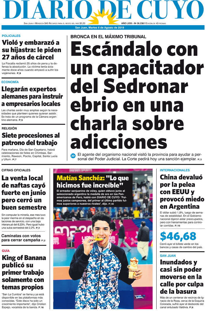 Diario de Cuyo | HOME | Noticias | Tapa Edición Tapa Edición 6 de Agosto 2019 Por Redacción Diario de Cuyo 05/08/2019 · 0:00 Escuchar la noticia Escuchar la noticia Your browser doesn’t support HTML5 audio Tapa Edición Ver los comentarios ›