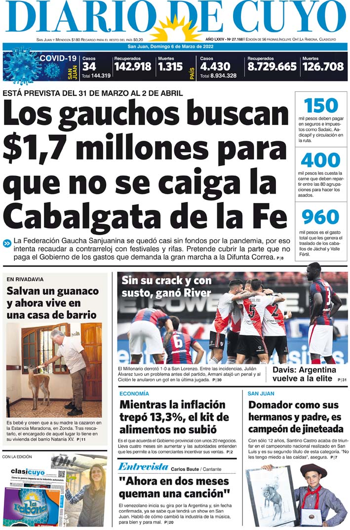 Diario de Cuyo | HOME | Noticias Tapa Edición 6 de Marzo de 2022 Por Redacción Diario de Cuyo 05/03/2022 · 0:00 Escuchar la noticia Escuchar la noticia Your browser doesn’t support HTML5 audio Ver los comentarios ›