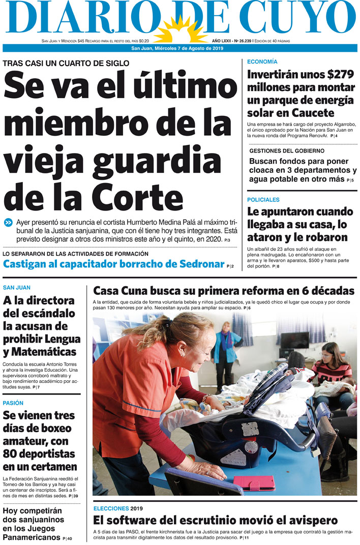 Diario de Cuyo | HOME | Noticias | Tapa Edición Tapa Edición 7 de Agosto 2019 Por Redacción Diario de Cuyo 07/08/2019 · 0:00 Escuchar la noticia Escuchar la noticia Your browser doesn’t support HTML5 audio Tapa Edición Ver los comentarios ›