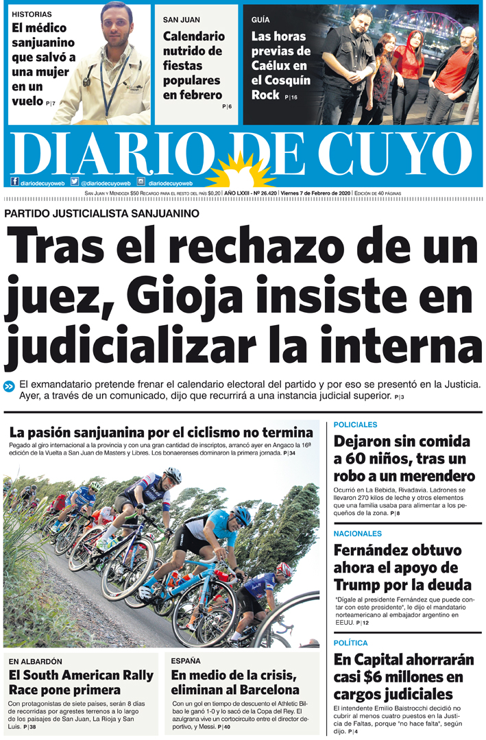 Diario de Cuyo | HOME | Noticias | Tapa Edición Tapa Edición 7 de Febrero 2020 Por Redacción Diario de Cuyo 06/02/2020 · 0:00 Escuchar la noticia Escuchar la noticia Your browser doesn’t support HTML5 audio Tapa Edición Ver los comentarios ›