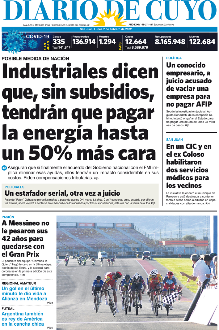 Diario de Cuyo | HOME | Noticias Tapa Edición 7 de Febrero de 2022 Por Redacción Diario de Cuyo 06/02/2022 · 0:00 Escuchar la noticia Escuchar la noticia Your browser doesn’t support HTML5 audio Ver los comentarios ›
