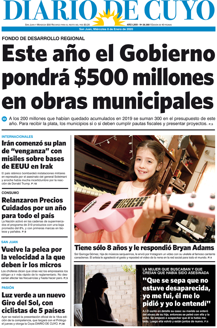 Diario de Cuyo | HOME | Noticias | Tapa Edición Tapa Edición 8 de Enero 2020 Por Redacción Diario de Cuyo 07/01/2020 · 0:00 Escuchar la noticia Escuchar la noticia Your browser doesn’t support HTML5 audio Tapa Edición Ver los comentarios ›