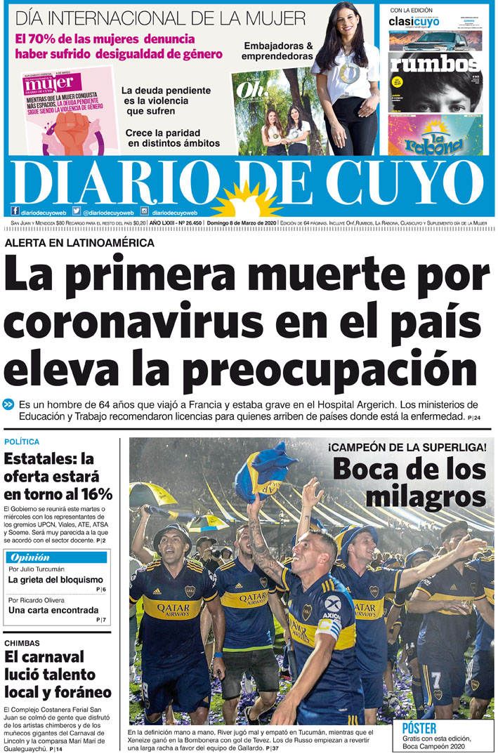 Diario de Cuyo | HOME | Noticias | Tapa Edición Tapa Edición 8 de Marzo de 2020 Por Redacción Diario de Cuyo 08/03/2020 · 0:00 Escuchar la noticia Escuchar la noticia Your browser doesn’t support HTML5 audio Tapa Edición Ver los comentarios ›