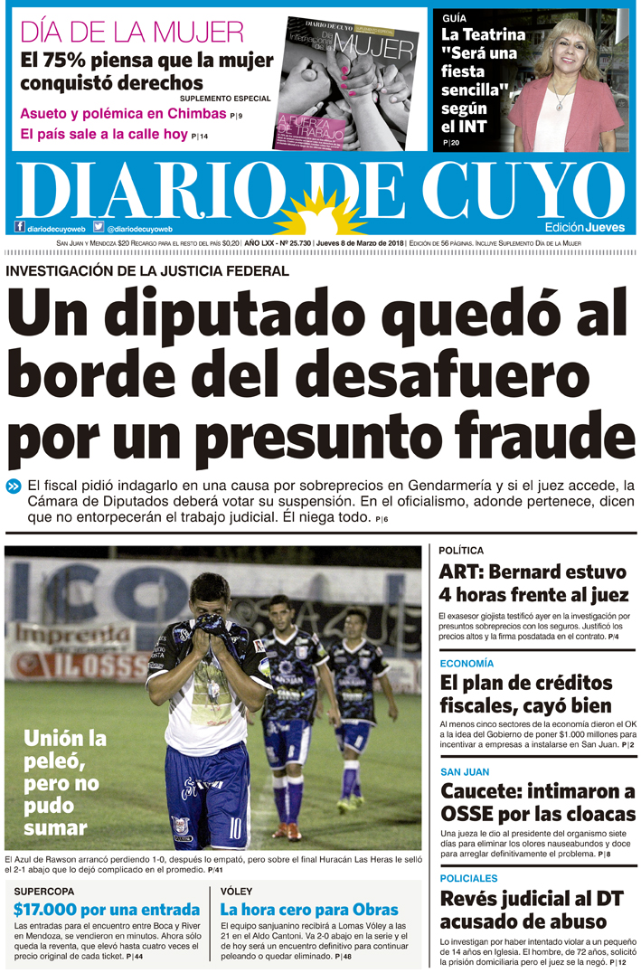 Diario de Cuyo | HOME | Noticias | Tapa Edición Tapa Edición 8 de Marzo del 2018 Por Redacción Diario de Cuyo 08/03/2018 · 0:00 Escuchar la noticia Escuchar la noticia Your browser doesn’t support HTML5 audio Tapa Edición Ver los comentarios ›