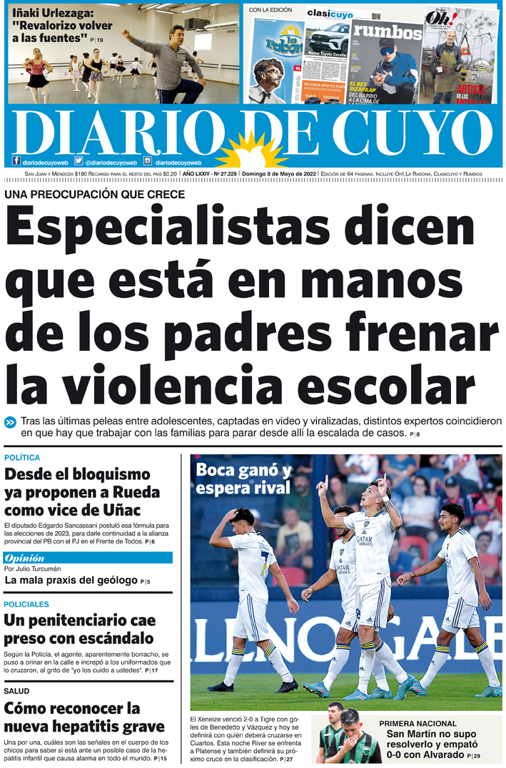 Diario de Cuyo | HOME | Noticias Tapa Edición 8 de Mayo de 2022 Por Redacción Diario de Cuyo 07/05/2022 · 0:00 Escuchar la noticia Escuchar la noticia Your browser doesn’t support HTML5 audio Ver los comentarios ›
