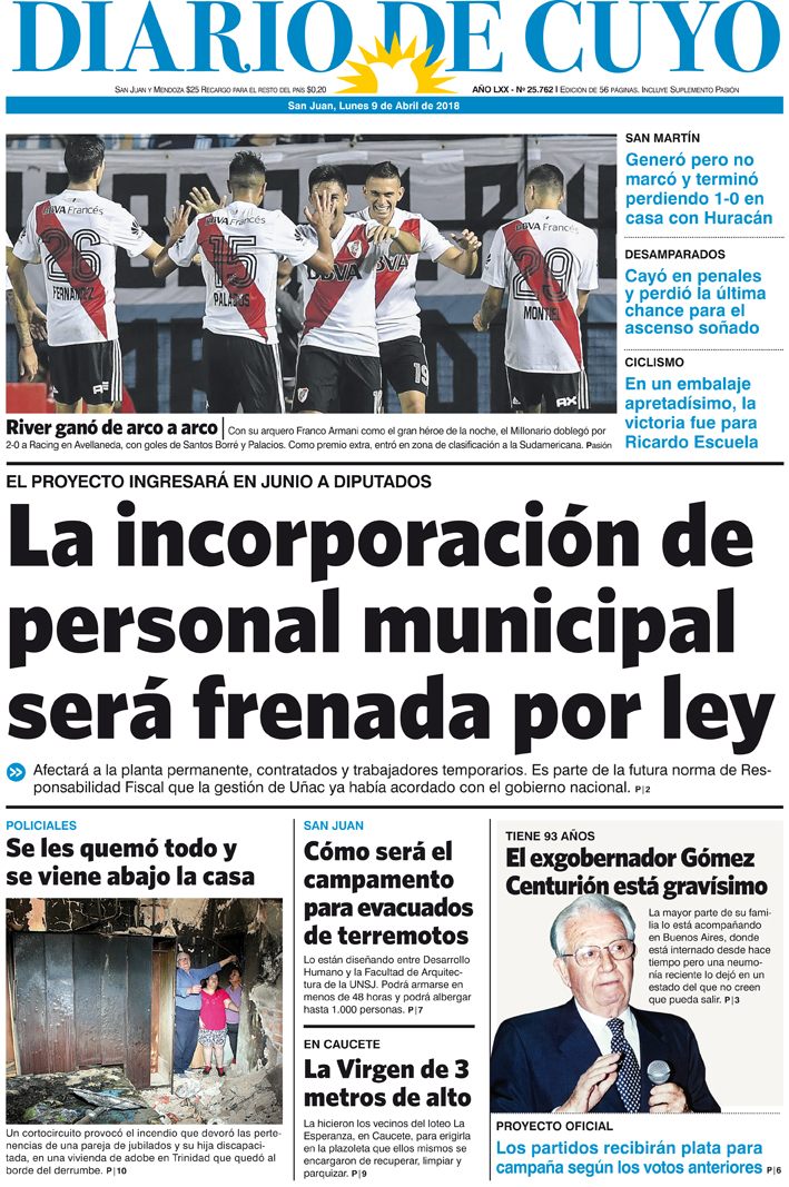 Diario de Cuyo | HOME | Noticias | Tapa Edición Tapa Edición 9 de Abril del 2018 Por Redacción Diario de Cuyo 09/04/2018 · 0:00 Escuchar la noticia Escuchar la noticia Your browser doesn’t support HTML5 audio Tapa Edición Ver los comentarios ›
