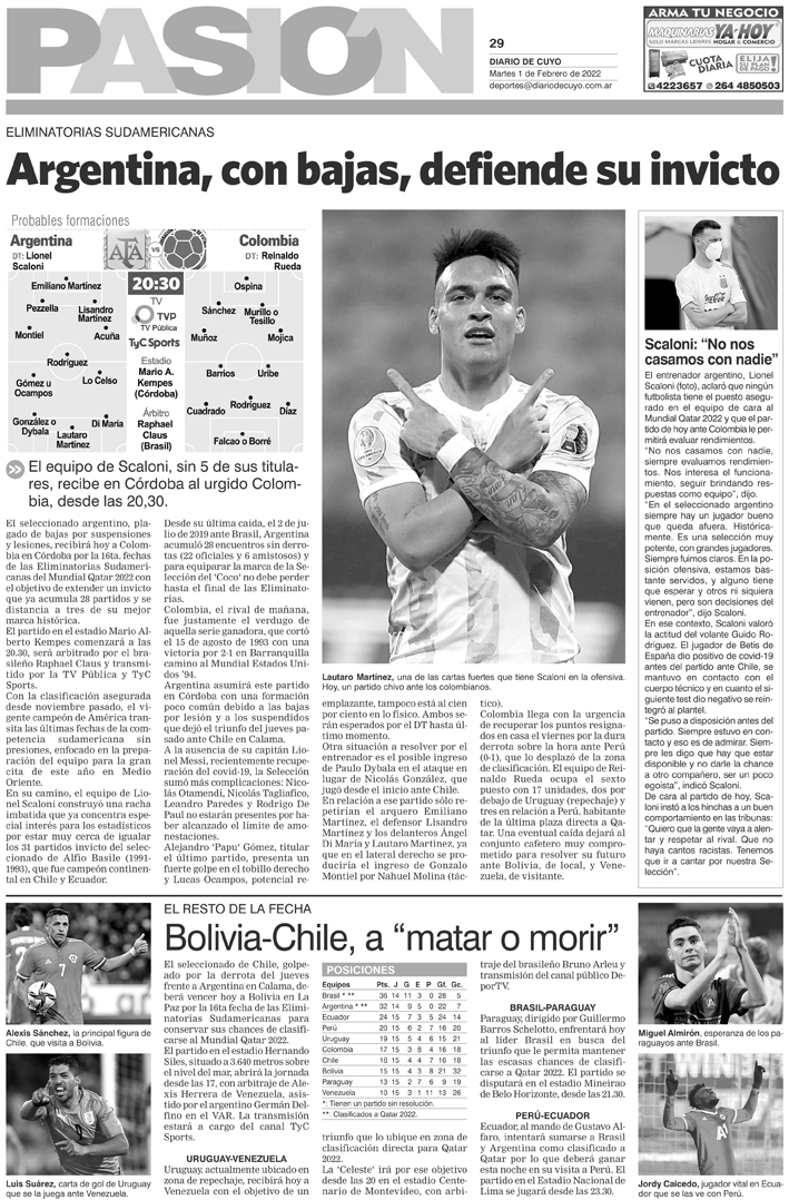 Diario de Cuyo | HOME | Noticias Tapa Pasión 01 de Febrero del 2022 Por Redacción Diario de Cuyo 31/01/2022 · 0:00 Escuchar la noticia Escuchar la noticia Your browser doesn’t support HTML5 audio Ver los comentarios ›