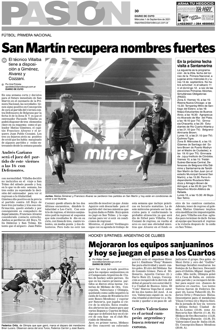 Diario de Cuyo | HOME | Noticias Tapa Pasión 01 de Septiembre del 2021 Por Redacción Diario de Cuyo 31/08/2021 · 0:00 Escuchar la noticia Escuchar la noticia Your browser doesn’t support HTML5 audio Ver los comentarios ›