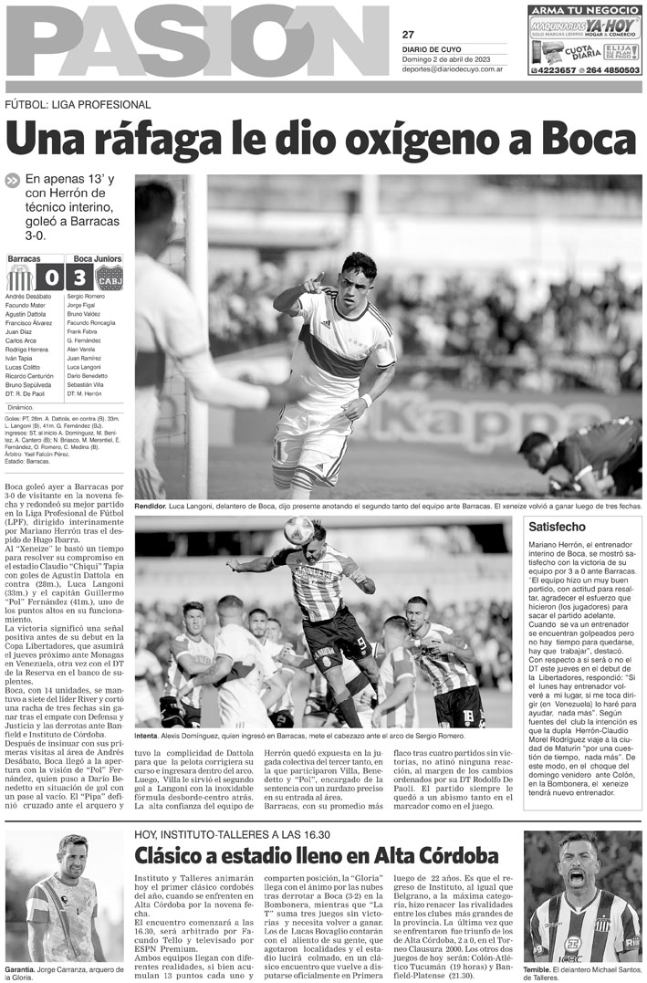 Diario de Cuyo | HOME | Noticias Tapa Pasión 02 de Abril del 2023 Por Redacción Diario de Cuyo 01/04/2023 · 0:00 Escuchar la noticia Escuchar la noticia Your browser doesn’t support HTML5 audio Ver los comentarios ›
