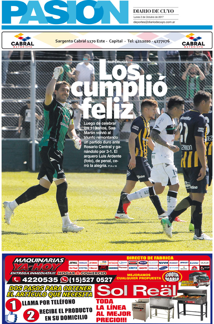 Diario de Cuyo | HOME | Noticias Tapa Pasión 02 de Octubre de 2017 Por Redacción Diario de Cuyo 02/10/2017 · 0:00 Escuchar la noticia Escuchar la noticia Your browser doesn’t support HTML5 audio Ver los comentarios ›