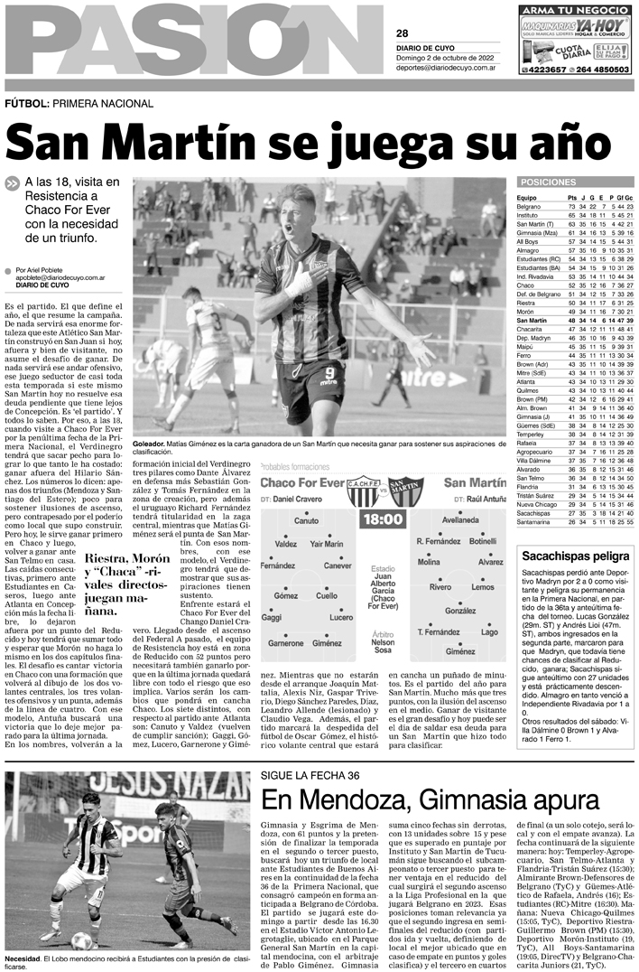 Diario de Cuyo | HOME | Noticias Tapa Pasión 02 de Octubre del 2022 Por Redacción Diario de Cuyo 01/10/2022 · 0:00 Escuchar la noticia Escuchar la noticia Your browser doesn’t support HTML5 audio Ver los comentarios ›