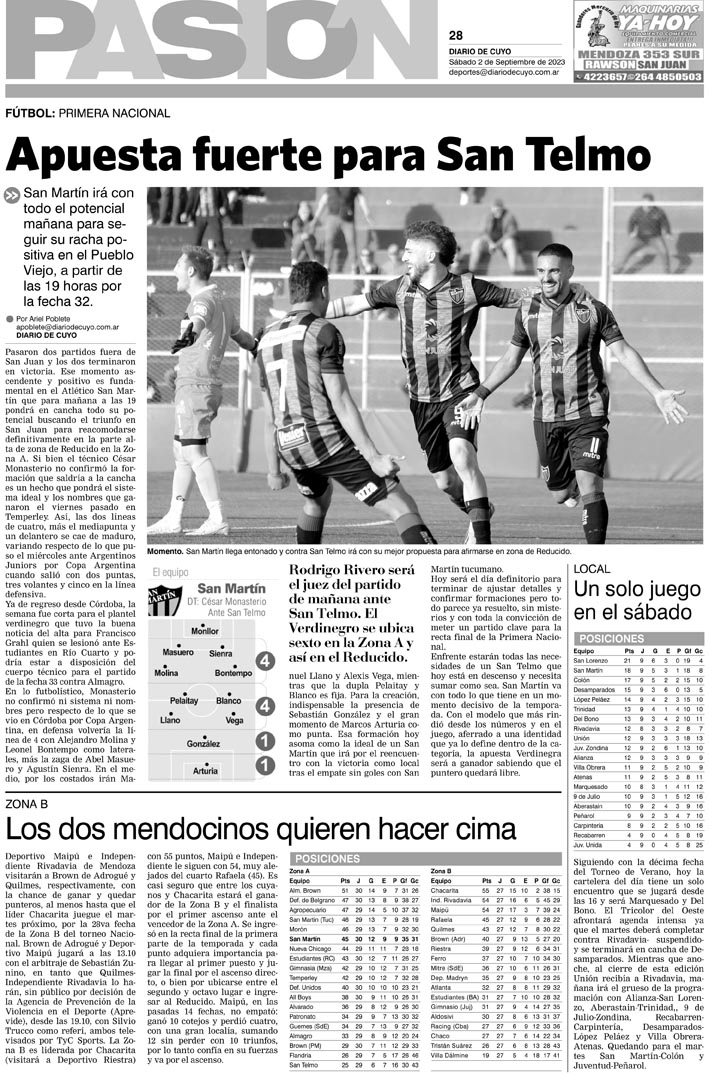 Diario de Cuyo | HOME | Noticias Tapa Pasión 02 de Septiembre del 2023 Por Redacción Diario de Cuyo 01/09/2023 · 0:00 Escuchar la noticia Escuchar la noticia Your browser doesn’t support HTML5 audio Ver los comentarios ›